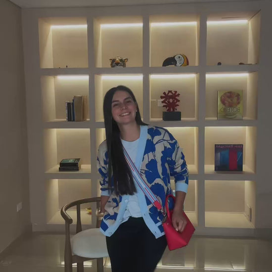 Cardigan Oversized tejido, color beige y azul. 100% Colombiano