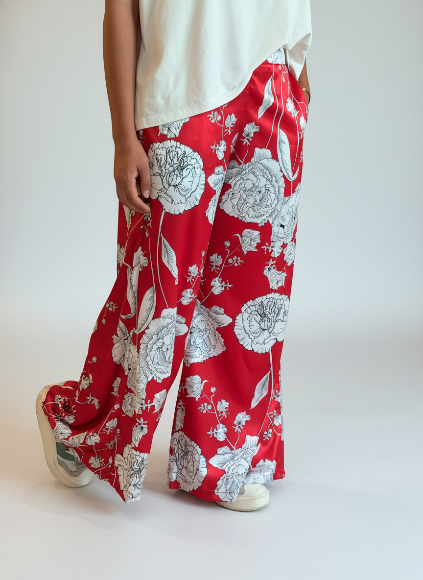Pantalón tipo palazzo en satin calibre medio estampado, con bolsillos laterales y pretina resortada en la parte de atrás