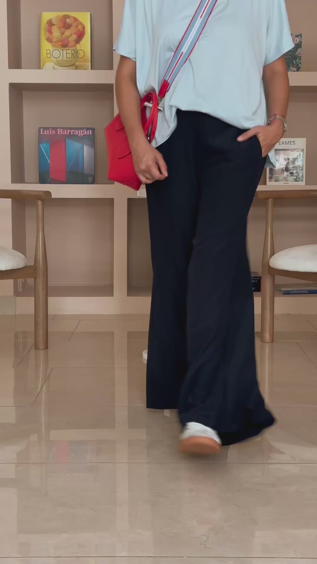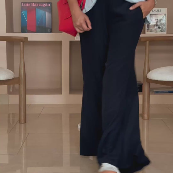 Pantalón Palazzo con bolsillos laterales y pretina en resorte en la parte de atrás.