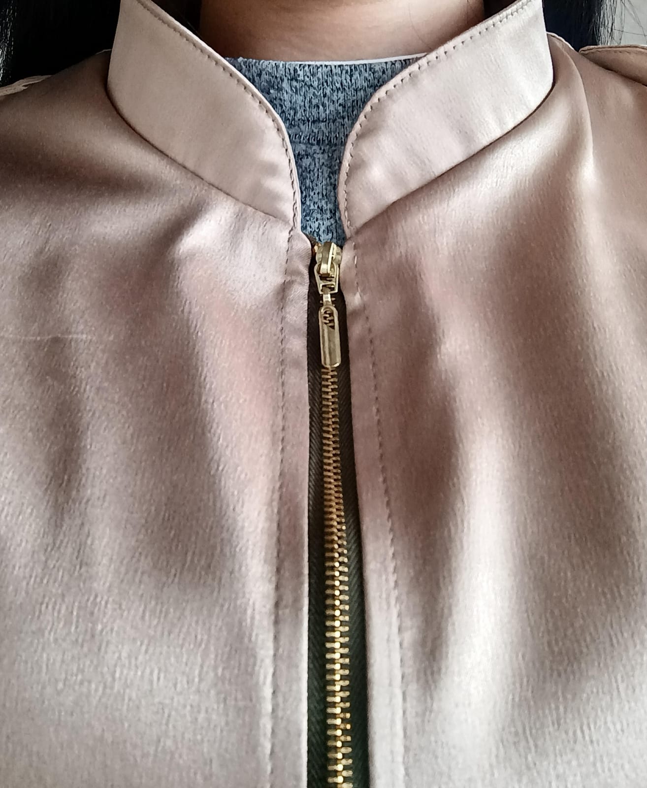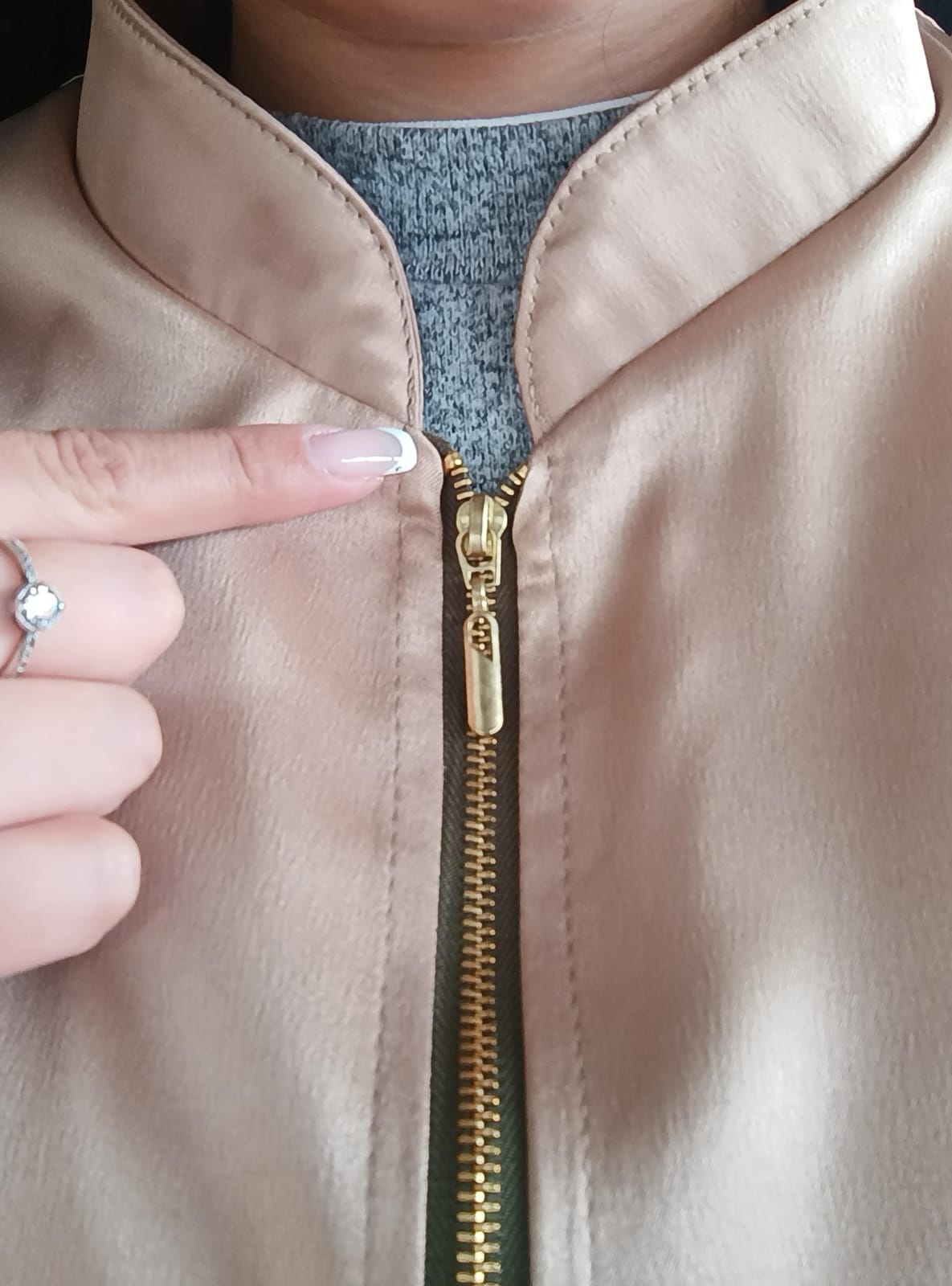 -Terminación de la cremallera en la parte superior queda un poco más arriba del lado izquierdo lo que genera una pequeña inclinación hacia la derecha. (únicamente se nota cuando la cremallera está cerrada hasta arriba).