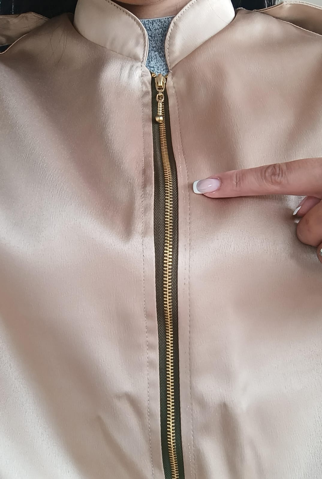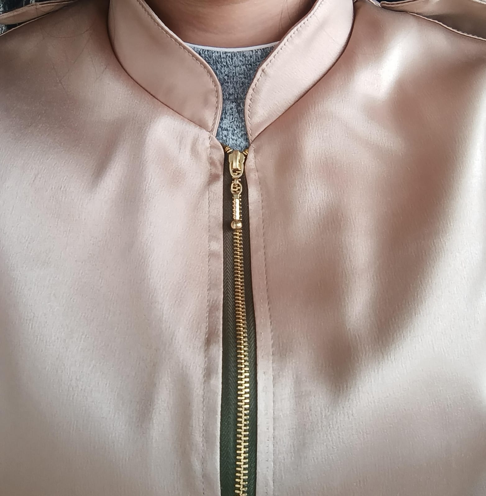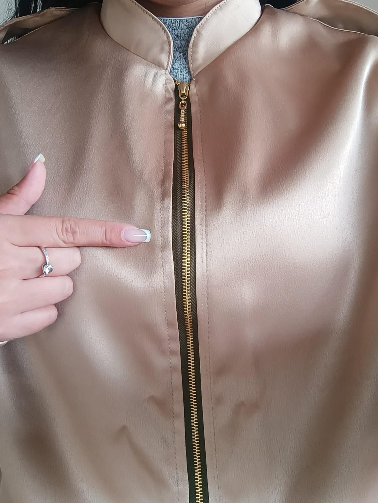 Chaqueta liviana en tela podesua color dorado, con cremallera en cobre y bolsillos laterales y forro vinotinto.
