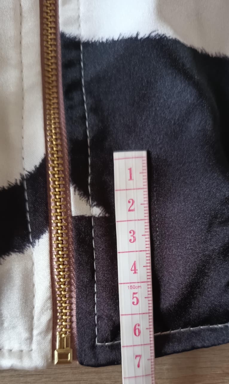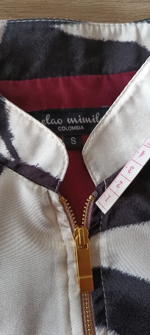 Chaqueta liviana en seda satín calibre medio estampada, con bolsillos laterales y cremallera en cobre central